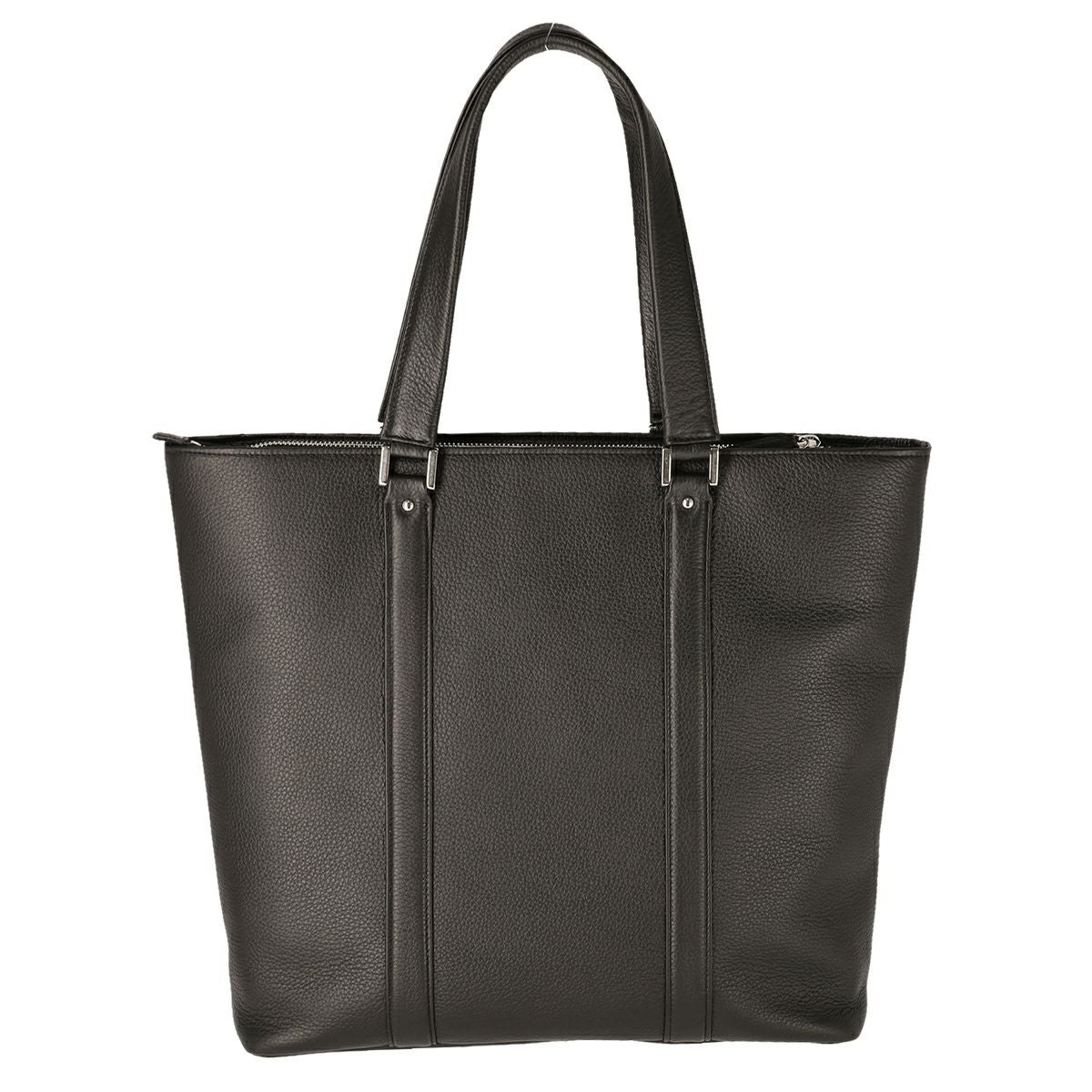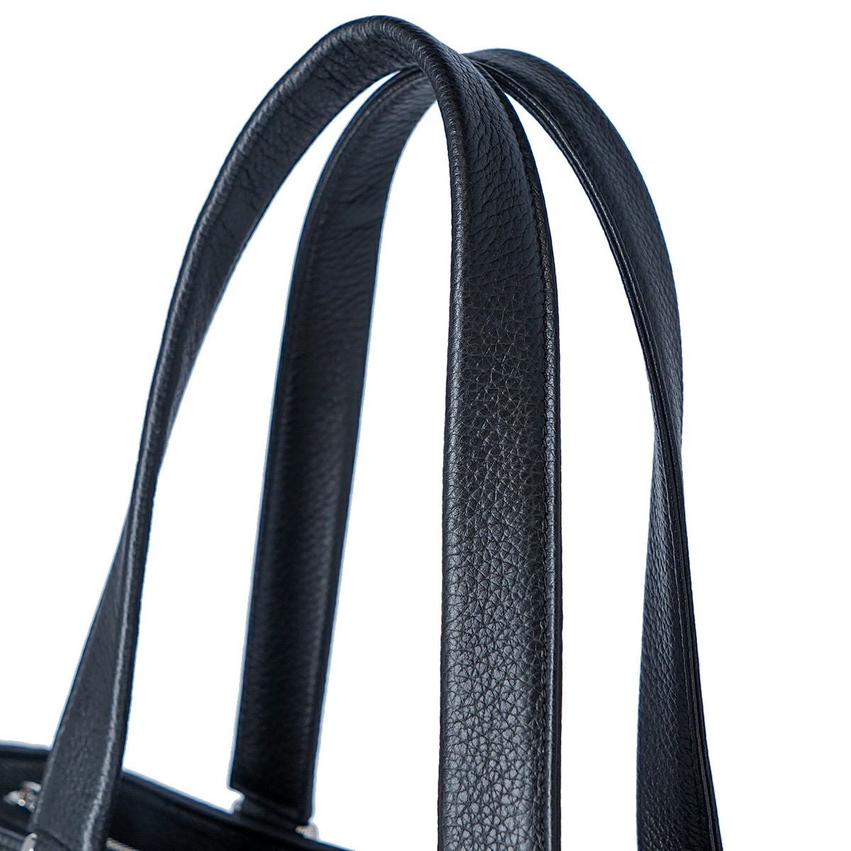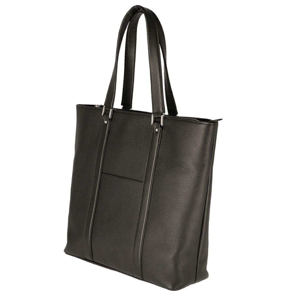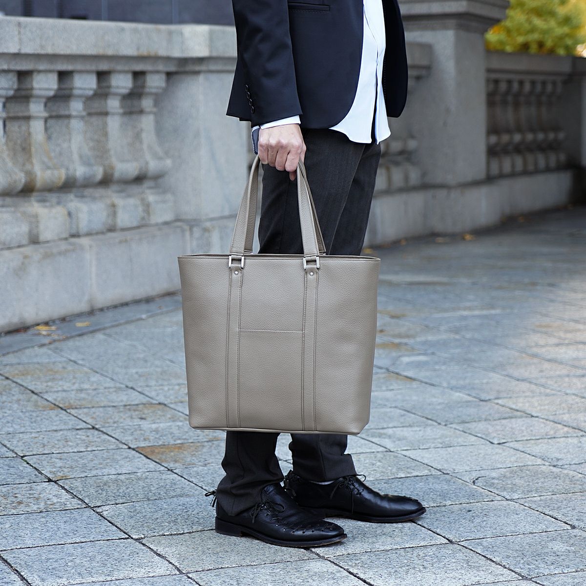 姫路レザーを使用してMADE IN TOKYO で生産された本革シュリンク縦型トートバッグです。 開口部には使い勝手の良い天井ファスナーと、そのサイドには浅くて取り出しやすいファスナーポケットがあり、内装にも3つのオープンポケットと1つの ファスナーポケットがあります。A4 ファイルは縦にも横にも難なく収納可能です。