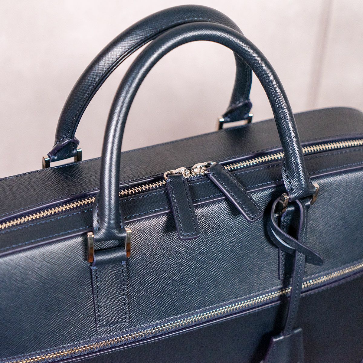 姫路でなめされた牛革を使用。細かい型押し(サフィアーノ)を施すことで表面は硬く、コシのある柔軟な仕上がりです。また、型押しすることで傷が目立ちにくく、雨に濡れた場合も簡単に拭き取ることができます。マチ幅は薄く3 方に開く為、荷物の出し入れがし易い作りとなっています。 鞄本体は自立する、かっちりとした印象のビジネスバッグです。